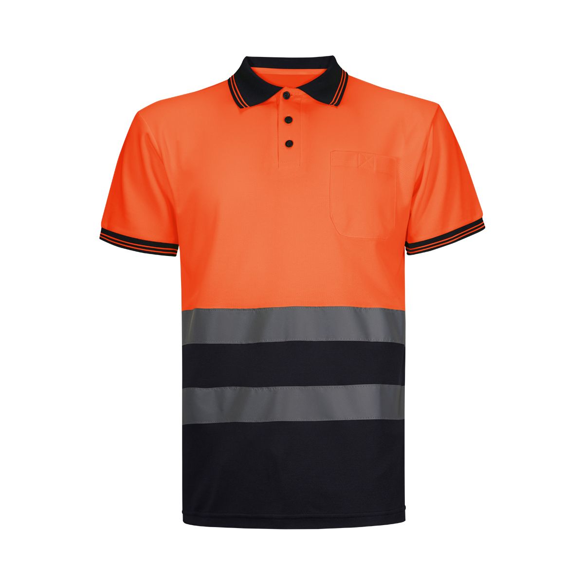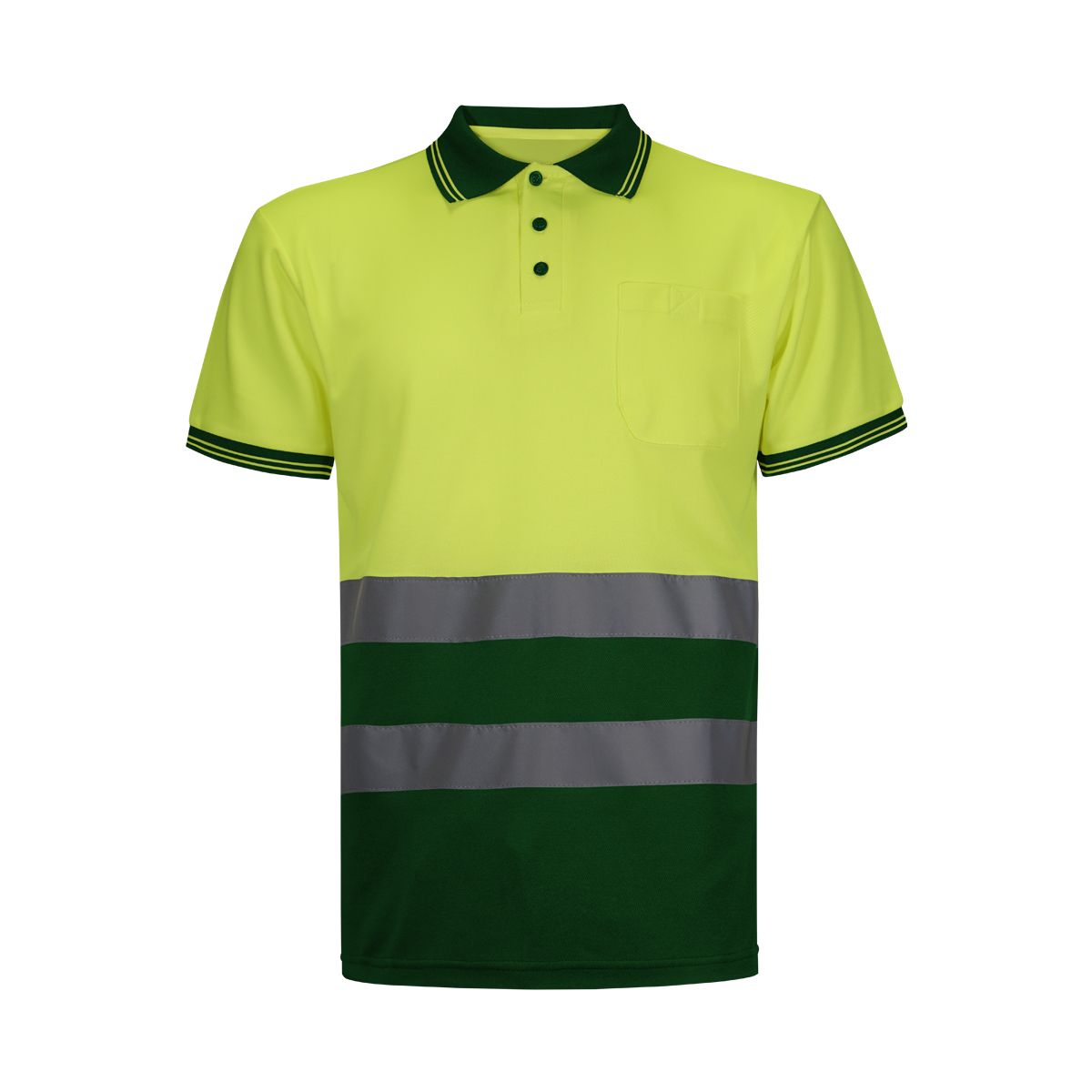 Polo piqué especial combinado de alta visibilidad. Con bolsillo de parche delantero izquierdo con cierre de velcro. 3 botones en color marino a contraste. Manga con puño y cuello de canalé con vivos amarillos. Doble costura en hombros y sisa. Abertura lateral.